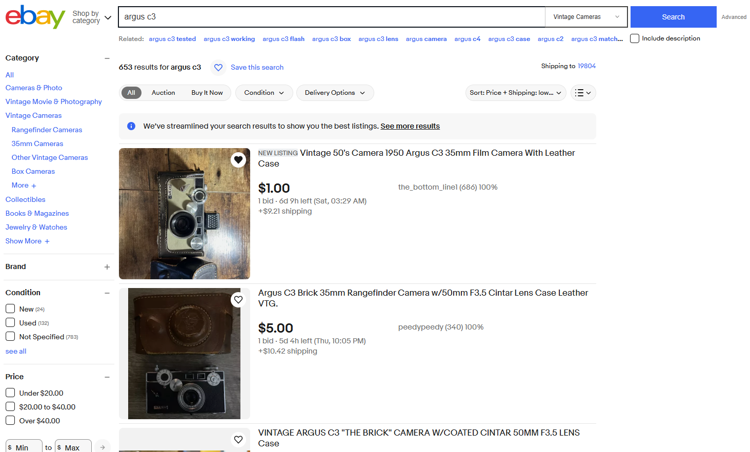 이런 상황에서 어떻게 구매를 할까 하다가 이베이에서도 많이 판매하고 있고 특히 경매 시스템이 있다는 것을 잊고 있다가 다시 알게 되었다. 그렇게 이베이에서 처음 Argus C3를 검색했을 때... 엄청나게 많은 매물과 저렴하게 형성된 가격을 보고 바로 여기다고 생각하게 되었다.