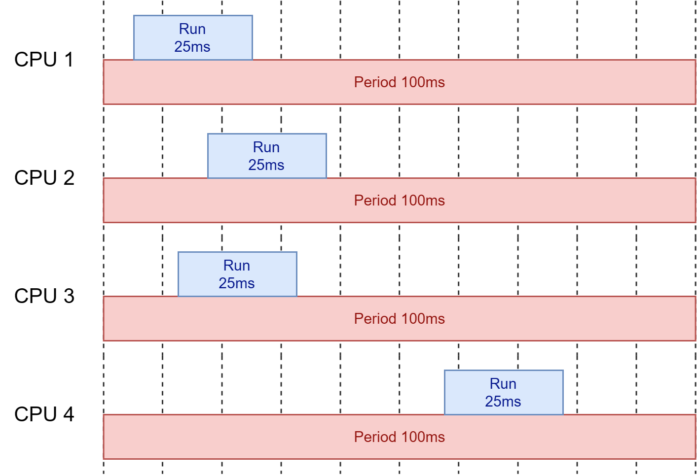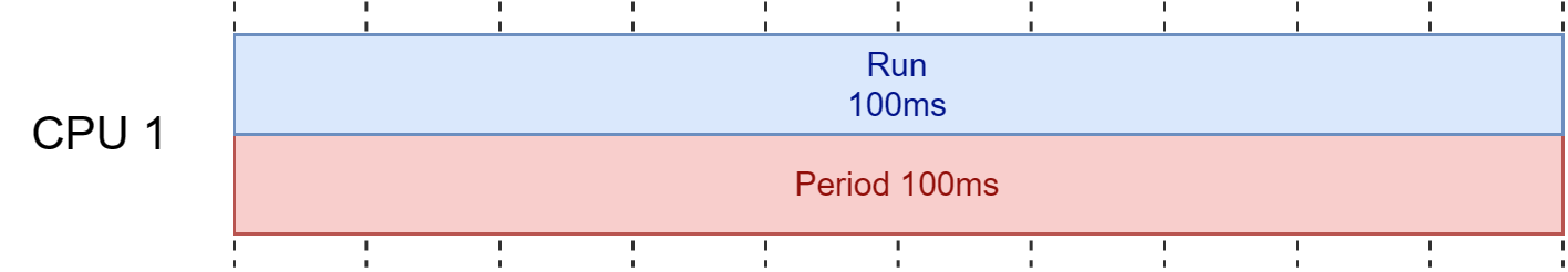 만약 CPU Period 값이 기본값이며 Quota를 100ms(100000µs)로 설정하면 100ms 주기동안 CPU를 100ms 만큼 사용하여 다음 주기가 오기 전까지 멈추지 않고 계속 실행하며 다음 주기가 와도 동일하게 멈추지 않고 계속 실행된다.