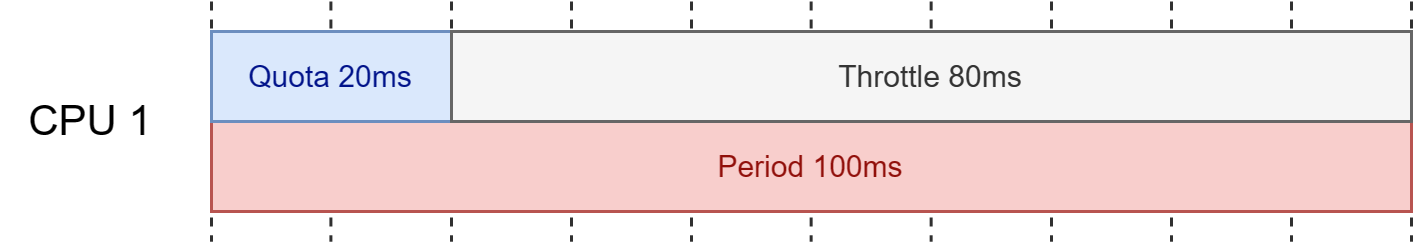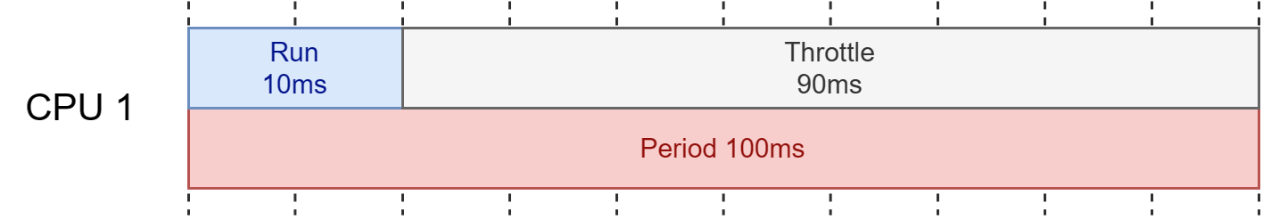 만약 CPU Period 값이 기본값이며 Quota를 10ms(10000µs)로 설정하면 100ms 주기동안 프로그램은 CPU를 10ms 만큼만 사용하여 실행하며 나머지 90ms 동안은 멈춰있게 된다. 그리고 다시 100ms가 지나면 다시 10ms 만큼 사용하여 실행하며 다시 90ms 동안 멈추며 반복하게 된다. 여기서 멈추는 것은 일반적으로 쓰로틀링(Throttling) 걸린다고 한다.